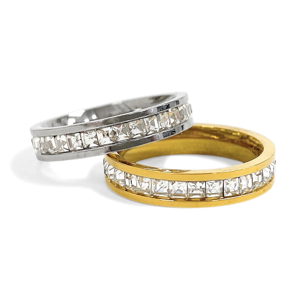 リングライン全体にスクエアカットのキュービックジルコニアを贅沢にあしらい、